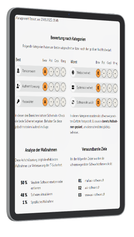 Wir halten uns bei der Bearbeitung mit unserem IT-Securitycheck vollständig an die DSGVO sowie das nDSG (Schweiz). Die Rechenzentren in denen die Auswertung und der Check durchgeführt werden, sind in Deutschland und und nach ISO27001, 27017, 27013, PCI DSS, u.v.m. zertifiziert). Zudem wird unser Unternehmen laufend nach DIN SPEC 27076 auditiert.